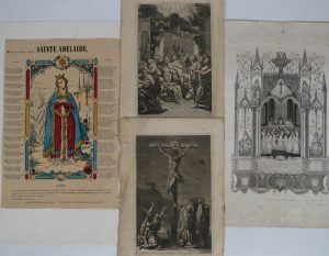 Techniques variées, eaux-fortes et bois principalement, certaines rehaussées, formats moyen à grand (bonne condition générale sauf qqs pet. défauts). 5 bois d'imagerie populaire rehaussés de couleur (SS Adélaïde, Éloi, Suzanne, Sainte Trinité, Concile oecuménique de 1869) et 1 lithographie (St Roch).-- 4 feuillets extraits d'un missel d'autel (défraîchis).--