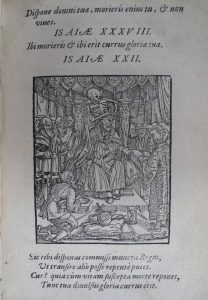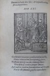 In-8° : [95]-[1 bl.] lvs (slightly but uniformly browned). Conremporary binding over wooden boards : calf, boards with 2 different blindstamped panels figuring biblical scenes within frames of lines and floral roll-stamps with portrait medaillons (decorated spine and brass clasps renewed, small professional restorations at the lower edges of the boards). Sixth Cologne-edition (princeps : 1555) of the "Dance of Death" with 55 fine woodcuts by Antonius Sylvius (c. 1555-1599; his monogramme on B2 and B3) based on the original Lyonese series after Hans Holbein the Younger. Each woodblock with a Biblical caption and an emblematic 4-line thematic commentary by Georgius Aemilius. The second part contains the moral treatise "Medicinae animae", prayers, reflexions and sermons on death by Cyprian of Carthage, Caspar Huberinus, Urbanus Rhegius and John Chrysostom.