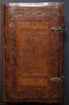 VERY FINE, DATED (1574) AND WELL PRESERVED CONTEMPORARY PANEL-STAMPED BINDING figuring the Annunciation to the Virgin (front) and Christ's Baptism (rear) with latin text on 2 lines at the bottom of each panel (7,1 x 4,1 cm; "Virgo Maria Dei Ma//ter Sanctissimis Sal" and "Hic est Filius Meus//Dilectus In Quo Mi"). Richly decorated frames with portrait medaillons between floral ornaments.