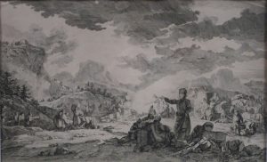 •Paysans expulsés d'une vallée. Eau-forte, 20,8 x 33,6 cm (à vue), papier vergé. Sous passe-partout, vitre et cadre (non désencadrée).