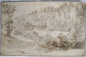 DESSIN ORIGINAL, plume à l'encre bistre et lavis à l'encre grise, 19,4 x 30,4 cm, papier vergé non filigrané, collé en plein sur carton léger cerné d'un trait d'encre noire (ligne verticale centrale, rouss.).