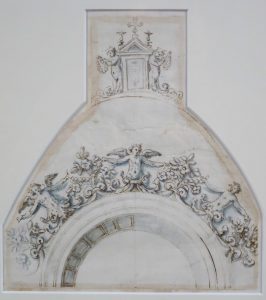 ÉTUDE D'UNE FRISE D'ANGELOTS et GUIRLANDE de FLEURS en demi-cercle surmontant une arcade à caissons, sommée d'un petit fronton de style renaissance. [C. 1600].