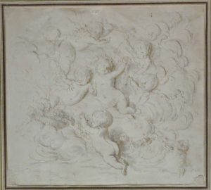[Attribué à LA RUE, Philibert Benoit de (1718-1780)].- Étude d'amours sur fond de nuages avec corbeille et guirlandes de fleurs. [ 18e siècle].