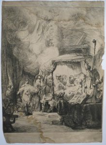 Copie inversée d'après REMBRANDT (1606-1669). 1783. E.-f., 38,5 x 30,8 cm, papier vergé filigrané (rognée sur cuv. la à g., avec perte à dr., déchirure avec manque au milieu à dr., grande mouill. brune en bas à g., pliures, défraîchie).