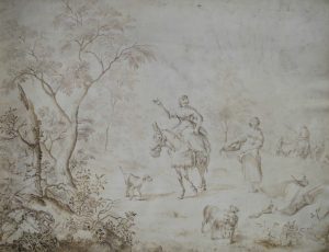 DESSIN ORIGINAL au fin trait à la plume à l'encre bistre, 29 x 37,5 cm, sur peau de vélin cernée d'un trait à l'encre bistre (pet. galerie de vers sur 2 cm au centre du bord g. doublée de papier au verso, qqs lég. rouss. dans le bas). Dessin d'une bonne main figurant une femme assise en amazone sur un âne joliment harnaché, des paysans et animaux. Végétation finement détaillée.