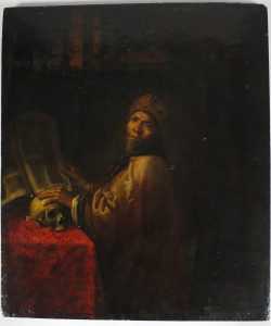 HOMME DANS SON CABINET DE TRAVAIL, une main posée sur un livre ouvert, l'autre posée sur un crâne. [Fin 17e début 18e siècle].