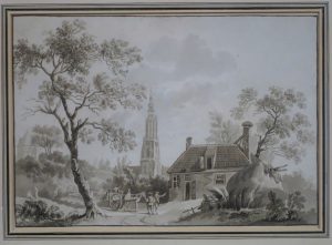 PAYSAGE HOLLANDAIS avec fermiers et cheval avec charrette devant une ferme, avec vue sur la grande tour d'une église gothique. [ 18e siècle].