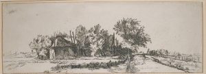 •Paysage avec grange à foin, ferme, grand arbre et palissade. 1659. E.-f., TC 7,7 x 20,3 cm, papier vergé teinté, datée en haut à dr., fixée sous passe-partout (pet. perforation en haut à g.).