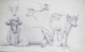 DESSINS ORIGINAUX, crayon, pierre noire, plume et crayon, sanguine, plume et lavis à l'encre bistre, papier vergé ou vélin, dimensions variées de 7,4 x 9,8 à 16,8 x 28,2 cm, fixés par les coins sup. sous passe-partout ou collés en plein sur carton de support (quelques faibles taches). 5 études de vaches d'une seule main du 19e siècle.--