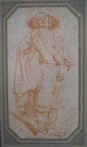 (2). Étude de paysan en pied avec chapeau et bottes. Crayon sanguine, 26 x 14 cm (à vue), papier vergé collé en plein sur carton de support et fixé sous passe-partout octogonal (qqs taches foncées en haut au centre, pet. taches brunes plus concentrées dans le bas).--