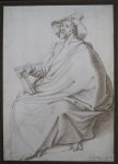 (1). Homme assis tenant un livre. Plume à l'encre bistre, 26,5 x 19 cm, deux petits symboles dans le coin inf. g. et n° "31" dans le coin inf. dr., papier vergé filigrané (coq tenant un écu avec la crosse de Bâle, attesté de 1591 à 1600; # Briquet 1380), fixé aux coins sup. sur f. de support, mention d'attribution erronée àJacob Matham sur le dessin et dans une notice sur le f. de support, la notice identifie le dessin comme étant un portrait du peintre-graveur Henri Goltzius.--