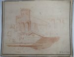 (3). Étude d'une ruine. Crayon sanguine, 14,8 x 18,4 cm, papier vergé collé en plein sur f. de support, attribution erronée "C. Van Loo" en bas à dr. (qqs taches brunes).