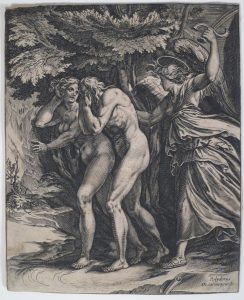ALBERTI, Cherubino (1553-1615).- Adam et Eve chassés du Paradis. [D'après Le Caravage (1571-1610)].