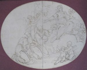 DESSIN ORIGINAL, plume à l'encre bistre et mine de plomb, mise au carreau à la mine de plomb surtout visible sur le côté g., 21,8 x 28 cm, papier vergé filigrané "J. Honig & Zoonen" (# Heawood 3345) découpé en médaillon et cerné d'un trait bistre, attribution ms. moderne erronée au Dominiquin (1581-1641) au verso, fixé par le bord sup. sur f. de support (pli vertical central, pet. rouss.).