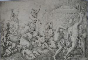 [ PODESTA, Giovanni Andrea (1608-1674)].- L' Age d'Or, ou Bachanale au pied d'un autel, avec faune, femmes et enfants. [D'après Titien (c. 1488-1576)]. Roma, Gio. Jacomo de Passe, 1649.