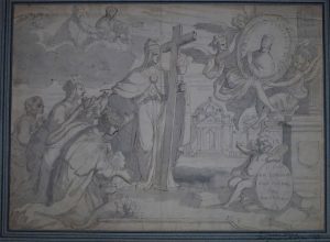 À l'avant-plan, mention dans un médaillon tenu par un angelot "D.O.M. FR. BORGIA. DUX GAND. POS. AN. MDXLV." et à l'arrière-plan la façade d'une église baroque.