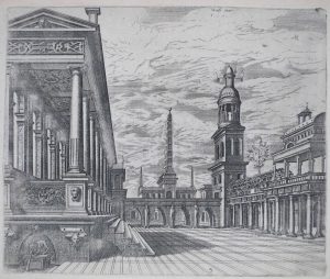 •VREDEMAN de VRIES, Joannes.- Variae architecturae formae. Anvers, Theodorus Galle, 1601. In-4° oblong : titre et 20 planches; broché (tirage de qualité moyenne, ex. faiblement jauni, cachet de coll. sur titre).