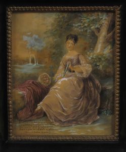 Composition romantique figurant la Malibran assise sur un rocher dans un décor campagnard, un éventail à la main, un cachemire et un bouquet de roses près d'elle. Maria Malibran (Paris 1808-1836 Manchester) fut "la" grande artiste lyrique de son époque.