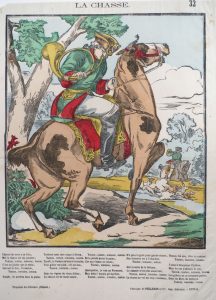 Techniques et formats divers moyen à grand. Dont : "La Chasse". Épinal, Pellerin, s.d. Grand bois rehaussé.-- 3 eaux-fortes sur Chine appliqué, extraites du premier album de la Société des Aquafortistes, 1863, dont 1 signée Alfred Darjou.-- 2 aquatintes rehaussées figurant une chasse au sanglier en Allemagne. London, Edward Orme, 1813.-- VERNET, Horace.- "Le Braconnier". Lithogr. rehaussée (mouill., usures).