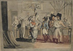 Eau-forte et aquatinte, rehaussée à l'aquarelle, cuv. 33 x 42 cm, TC 30 x 39 cm (déchirures marg., part. brunie dans la partie sup.). Visite chez le réparateur et monteur d'armes blanches, avec quelques détails amusants comme le chien qui se soulage et le militaire blessé.