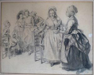 DESSIN ORIGINAL, crayon gras et fusain, 22,8 x 28,8 cm (à vue), papier vélin, monogrammé en bas à dr. "MD" (qqs froissures et usure du papier en bas, mouill. au centre du bord dr. n'entravant pas la lecture du sujet, pet. déchirure sur 1,5 cm à g. du monogramme, ombre lég. teintée en bas de la jupe du personnage central). Sous vitre, passe-partout, cadre de bois doré (non désencadré).
