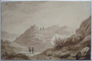 DESSIN ORIGINAL, pinceau et lavis à l'encre bistre sur mine de graphite, 7,7 x 12 cm (à vue), papier vélin, mention ms. contemporaine au verso du cadre "Van Wijngaerdt A. J." (très pet. déchirure au coin sup. g. et légers petits plis au coin sup. dr., pet. point brun dans le ciel). Sous passe-partout, vitre et cadre de bois doré (non désencadré).