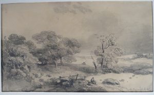Mine de graphite, 15,5 x 26 cm (à vue), sur papier vélin, signé et daté 1845 en bas à dr. Sous passe-partout, vitre et cadre de bois blond (non désencadré). "Paysagiste de grande valeur" (# Berko, 560).