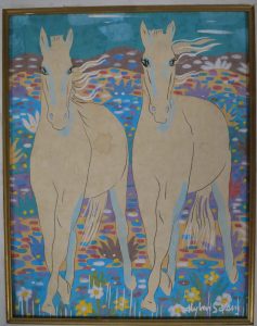 GOUACHE ORIGINALE, 28 x 22 cm, sur papier crème, signée en bas à dr. à la couleur blanche (lég. mouill. sur le papier dans le corps des chevaux et dans le haut). Sous cadre de bois blanc et or.