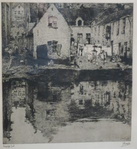 1906. Eau-forte, cuv. 38,5 x 35,5 cm + bonnes marges, papier Japon, signé et daté dans la pl. en bas à dr., titré "Veergreppe Gand" en bas à g. et signé en bas à dr. au crayon noir. Sous vitre et cadre de bois à effet écaille (qqs pet. manques). État définitif.