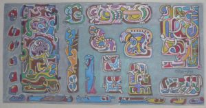 [19] 78. DESSIN ORIGINAL, crayons de couleur, 11 x 21,5 cm, monogrammé et daté au milieu à dr. Sous passe-partout de toile blanc cassé, vitre et cadre de bois doré. Peintre moderniste tourné vers l'art fantastique, graveur, sculpteur, créateur de bijoux. Une exposition rétrospective de ses oeuvres s'est tenue à l'Hôtel de ville de Bruxelles en 1990.