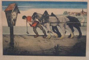 Un paysan avec deux chevaux de trait passe devant un calvaire dans une petite chapelle dans les champs.