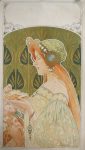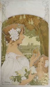 (2). Chromographie, 85,5 x 50 cm, signée en bas à g. et datée "1902". Une jeune femme à la chevelure brune, de profil droit, tient une poire de la main gauche et un bouquet de roses blanches dans la main droite. Petite fille dans le coin dr. (mouill. dans la marge de g. surtout en haut, qqs rouss., qqs déchirures marg.).