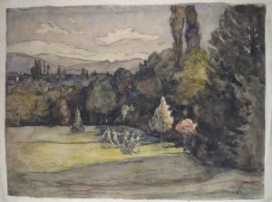 (3). "Le Galérien [?]". AQUARELLE et fusain, 24 x 32 cm, sur papier collé par les coins sur support, titrée et datée 1917 en bas à g., monogrammée et signée en bas à dr.