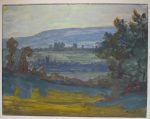 (1). "Charrone-en-Valromey". PEINTURE à l'huile délayée avec repasse au crayon gras noir et travail à sec, 28,5 x 46,5 cm, sur papier, titrée et signée en bas à dr.--