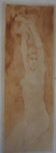 Pointe sèche et roulette, tirée en bistre, sur papier vergé, 31,5 x 11,6 cm + marges, cachet sec de la Société des aquafortistes en bas vers le milieu (feuille brunie, qqs pet. rouss.). Sous passe-partout, vitre et cadre de bois brun. # Rouir 388/2 (sur 2). Ne signale pas que le tirage était destiné à la "Société des Aquafortistes".