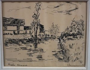 DESSIN ORIGINAL, trait à l'encre noire, 20 x 24,5 cm, titré en bas à g., signé en bas à dr. Sous passe-partout, vitre et cadre de bois clair naturel.