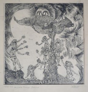 •BROYCKAERS (?), J.- "De fakir". Bois ou lino, signé (difficile à lire) et just. "n° 2".-- DELHAYE, José.- "Un espace temps Bruno". Eau-forte, signée sans prénom, just. 1/15.--