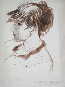 (2). THOMAS, Henri (1878-1972).- Buste de femme de profil. Pinceau à l'encre brune sur fusain, 28 x 21 cm, signé; collée sur support en papier (sali, support abîmé).--