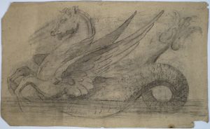 DESSIN ORIGINAL, plume à l'encre de Chine, lavis d'encre grise et bistre, rehauts à l'aquarelle rouge, rose et vert, papier vergé, 18,7 x 46,1 cm, collé en plein sur carton de support, titré à la plume "Prix remporté par M. Suys" sur le passe-partout de papier gris-bleu.