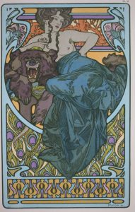 En ff., sous farde d'édition illustrée sur le plat sup. d'une composition de Mucha (usures, plats frottés surtout aux coupes, coins nus, lacets de fermetures manquants, tissu des mors part. déchirés, plat inf. avec manques de papier). Les planches 4, 15, 16, 21 et 22 sont tirées sur papier bleu collé sur feuillet de support. Planches tirées en un, deux ou trois tons sauf 15 (sur les 61 présentes) en couleurs.