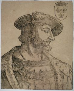 •5 portraits de rois de France dont 1 grande xylographie de François Ier de profil, attribuée à Hans Burgkmair l'Ancien (1473-1531) (ligne de cassure verticale du bois), 3 portraits d'Henri II, 1 tableau figurant 24 portraits de Pharamond à Charlemagne en imagerie populaire.--