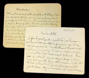 Huysmans Joris-Karl. Ensemble de 2 cartes autographes signées : — Sans date ; 2 pages in-16 oblongues. Il est en mauvaise santé et ne pourra se rendre chez son correspondant. « Au reste, si le gérant arefusé à Dutilleul, homme posé, ancien