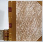 Reliure moderne par A. Buvat : demi-cuir brun à coins, plats de papier marbré, dos lisse avec filets dorés et étiq. de cuir rouge.