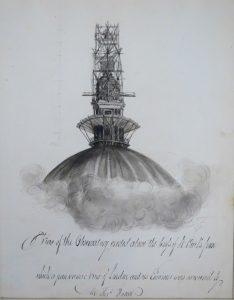 ORIGINAL PENCIL DRAWING with black ink, 20 x 15 cm, on wove paper (margins slightly browned). Upper corners pasted on paper board and under passepartout. Contemporary drawing of the temporary observatory constructed above St Paul's Cathedral in 1821.