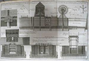 Avec aussi des plans des fortifications de Dunkerque, Toulon, Menin, Mons, etc., et de quelques villes antiques. La planche 39 du tome I figure un moulin à puiser de l'eau à Marseille avec des hommes enchaînés travaillant sous l'oeil de contremaîtres. Illustré en outre de 10 bandeaux (2 dans les ff. lim. et 8 montrant des travaux d'ingénierie civile).