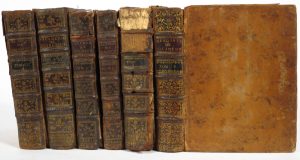 Rel. de l'époque : plein veau marbré, dos fleuronnés dorés à nerfs, tr. rouges (us., qqs mors lég. ou entièrement fendus, cuir du dos du vol. I décollé et part. manquant, éraflures, manques à qqs coiffes, coiffe inf. du vol. I absente...).
