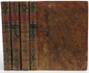 4 vol. in-4° : [8]-78, [4]-88, [4]-80, [4]-58-[12] pp.; 174 platen (kleine zwarte vlekjes passim, platen 14/15 en 38/39 van vol. I. omgewisseld, enkele platen met lichtgrijze omranding, lichte roestvlekken op beschermbladen van zijdepapier). Eigentijdse banden : gemarmerd leder, ruggen met ribben en goudstempeling, titel- en bandnummerschilden, gemarmerde sneden (platranden en -hoeken versleten, scharnieren versleten of gesplit, ruggen licht gewreven, 1 bandnummerschild ontbreekt).