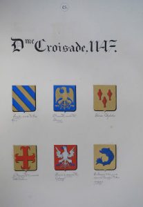 Composé de 3 ff. (titre et préface) et 41 ff. avec armoiries peintes. Celles des souverains et des principaux acteurs des croisades - Godefroy de Bouillon en tête - sont rassemblés au début, les autres sont ordonnées selon les 7 croisades, datées de 1096, 1147, 1190, 1212, 1218, 1248 et 1270.