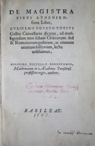 POSTEL, Guillaume.- De magistratibus atheniensium liber [...], ad intelligendam non solum graecorum, sed romanorum politiam, ac omnem veterum historiam, lectu utilissimus. Basileae, (ex officina Joannis Oporini, 1543.
