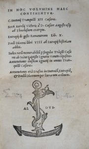 SUETONIUS, Tranquillus.- In hoc volumine haec continentur. C. Suetonii Tranquilli XX Caesares. Sexti Aurelii Victoris à D. Caesare Augusto usq[ue] ad Theodosum excerpta. Eutropii de gestis Romanorum Lib. X. Pauli Diaconi libri VIII ad Eutropii...